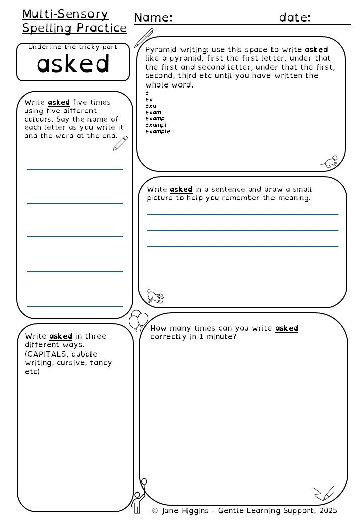 Shop Categories: Gentle Learning Resources Services offers Autism ADHD executive functions tuition learning resources Handwriting reading comprehension spelling resources maths resources workbooks freebies group activities children's classes typing Shop Gentle Learning Resources | Services | offers | Autism | ADHD | tuition | learning resources | group activities | Gentle Grammar and Spelling - Continuous Present Tense - adding s and es to verbs Sale Price: £6.00 Original Price: £10.00 Sale Add To Cart Added! SNIP Training For Teachers, Tutors, TAs and Other School Staff from £60.00 Sale Select Number of attendees Up to 10 Members Up to 20 Member Up to 30 Members CLICK HERE TO MAKE A SCHOOL OR GROUP BOOKING - or below to make a solo booking Added! SNIP Training For Parents, Carers, Guardians and Tutors Sale Price: £5.00 Original Price: £15.00 Sale CLICK HERE TO MAKE A SOLO BOOKING - or click below to make a school or group booking Added! KS3 Maths Group £144.00 Autumn One - 18th, 25th Sept’, 2nd, 9th, 16th & 23rd Oct’ 2025 Autumn Two - 6th, 13th, 20th & 27th Nov’, 4th & 11th Dec’ 2025 Winter - 8th, 15th, 22nd & 29th Jan’, 5th & 12th Feb’ 2026 Add to Cart Added! KS2 Literacy Group £144.00 Autumn One - 15th, 22nd & 29th Sept’, 6th, 13th & 20th Oct’ 2025 Autumn Two - 3rd, 10th, 17th & 24th Nov’, 1st & 8th Dec’ 2025 Winter - 5th, 12th, 19th & 26th Jan’, 2nd & 9th Feb’ 2026 Add to Cart Added! Study & Thrive - An Online Study Group for KS4 & KS5 £125.00 Add To Cart Added! Lego for Learning £96.00 Autumn 2025 - 16th 23rd Oct 13th 20th 27th Nov Winter 2026 - 8th 22nd 29th Jan 5th 12th Feb Spring 2026 - 26th Feb 5th 12th 19th 26th March Early Summer 2026 - 16th 30th Apr 7th 14th 21st May Late Summer 2026 - 4th 11th 18th 25th June 2nd July Add to cart Added! Learn to Touch Type £100.00 Add To Cart Added! Science Club £132.00 Autumn 2025 - 16th 23rd Oct 13th 20th 27 Nov Winter 2026 - 8th, 22nd, 29th Jan 5th, 12th Feb Spring 2026 - 26th Feb 5th 12th 19th 26th March Early Summer 2026 - 16th 30th Apr 7th 14th 21st May Late Summer 2026 - 4th 11th 18th 25th June 2nd July Add to Cart Added! Social Emotional Learning £78.00 Add To Cart Added! Telling The Time £84.00 Add to Cart Added! 8 Easy Reading Overlays £6.99 Add To Cart Added! Multisensory Spelling Packs - Phase Two Tricky Words £3.00 Add To Cart Added! Multisensory spelling packs - Phase Three Tricky Words £6.00 Add To Cart Added! Multisensory spelling packs - Phase Four Tricky Words £6.00 Add To Cart Added! Multisensory spelling packs - Phase 5 Tricky Words £5.00 Add To Cart Added! Multisensory Spelling Practice - Common exception word - Year one Sale Price: £8.00 Original Price: £15.00 Sale Add To Cart Added! Multisensory Spelling Practice - Common Exception Words - Year Two Sale Price: £12.00 Original Price: £18.00 Sale Multisensory Spelling Practice - Common Exception Words - Year two Added! Multisensory Spelling Practice - Common Exception Words - Year Three and Four Sale Price: £15.00 Original Price: £20.00 Sale Add To Cart Added! Multisensory spelling - there their they're £2.00 Add To Cart Added! wh and th pack 1 £5.00 Add To Cart Added! Could Would Should Multisensory Spelling Pack £2.00 Add To Cart Added! What is Autism...and How does it Affect Me? A workbook to help understand your sensory profile £15.00 Add To Cart Added! What is ADHD...and How Does it Affect me? An Executive Functioning Workbook £15.00 Add To Cart Added! Comprehension Activity Book - The Iron Man by Ted Hughes Sale Price: £10.00 Original Price: £14.00 Sale Add To Cart Added! Comprehension Activity Book - Fantastic Mr Fox by Roald Dahl Sale Price: £12.00 Original Price: £18.00 Sale Add To Cart Added! Gentle handwriting Practice Sheets £0.00 Add To Cart Added! Gentle Handwriting Sheets i l u t j Sale Price: £0.50 Original Price: £1.00 Sale Add To Cart Added! Gentle Handwriting Sheets r n m h b p Sale Price: £1.50 Original Price: £3.00 Sale Add To Cart Added! Gentle Handwriting Sheets e s f k Sale Price: £0.50 Original Price: £1.00 Sale Add To Cart Added! Gentle Handwriting sheets c a d g q o Sale Price: £1.50 Original Price: £3.00 Sale Add To Cart Added! Gentle Handwriting Sheets v w x y z Sale Price: £0.50 Original Price: £1.00 Sale Add To Cart Added! Gentle Handwriting Sheets CAPITAL letters Sale Price: £0.50 Original Price: £1.00 Sale Add To Cart Added! Emotional Regulation for Learning Workshop £80.00 Add To Cart Added! Times Tables Practice Summer 2025 £80.00 Add To Cart Added! Summer Handwriting Workshops £80.00 Add To Cart Added! SNIP Literacy Programme 1 - digital download £0.00 Add To Cart Added! SNIP Literacy Programme 2 £0.00 Add To Cart Added! SNIP Literacy Programme 3 £0.00 Add To Cart Added! SNIP Literacy Programme 4 £0.00 Add To Cart Added! SNIP 4 Checklist - for use with SNIP 4 Spelling Resource £0.00 Add To Cart Added! Block Busters Style Times Tables Games Sale Price: £8.00 Original Price: £11.00 Sale Add To Cart Added! GLS Ocean Track Game Sale Price: £0.00 Original Price: £1.00 Sale Add To Cart Added! GLS Jungle Track Game Sale Price: £0.00 Original Price: £1.00 Sale Add To Cart Added! GLS Racing Track Game Sale Price: £0.00 Original Price: £1.00 Sale Add To Cart Added! GLS Dinosaur Track Game Sale Price: £0.00 Original Price: £1.00 Sale Add To Cart Added! Monthly Parent Online Meeting £10.00 Monthly Parent Online Group Added! Attending meetings £75.00 Attending meetings Added! Letter Writing £70.00 Letter Writing Added! Form Filling £70.00 Form Filling Added!